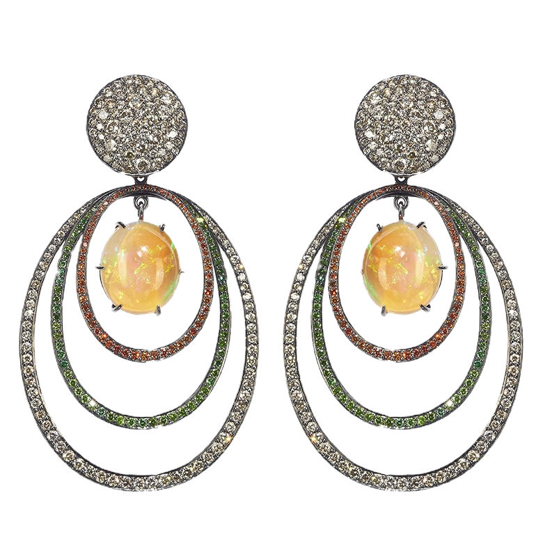 Der Türkis Blütenarmeif besteht aus 750/000 Weissgold und 750/000 Roségold und ist mit braunen und weißen Brillanten besetzt. Die Blütenblätter wurden in Handarbeit aus Türkis geschnitzt und haben insgesamt 27,70 ct. In der Mitte des Schmuckstücks wurde ein Turmalin mit 6,91 ct eingefasst.
